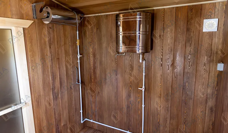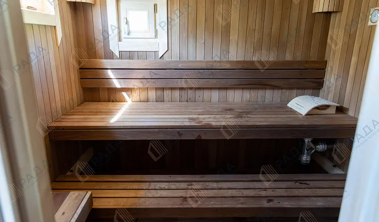 Особенностью данной модели является продуманная планировка и грамотное распределение зон отдыха, помывочной и разумеется парного отделения. По заказу клиента, мы спроектировали систему проливных полов не только в помывочной, но и в парном отделении – это позволяет обливаться водой в неограниченном количестве и увеличивается срок службы основания. Полки для парения как обычно «парящие», но выполнены они и подспинникиз кедра, а также этой породой дерева был обшит потолок. Также по желанию клиента мы установили бойлер и душевую стойку в помывочном отделении в модном черном цвете.